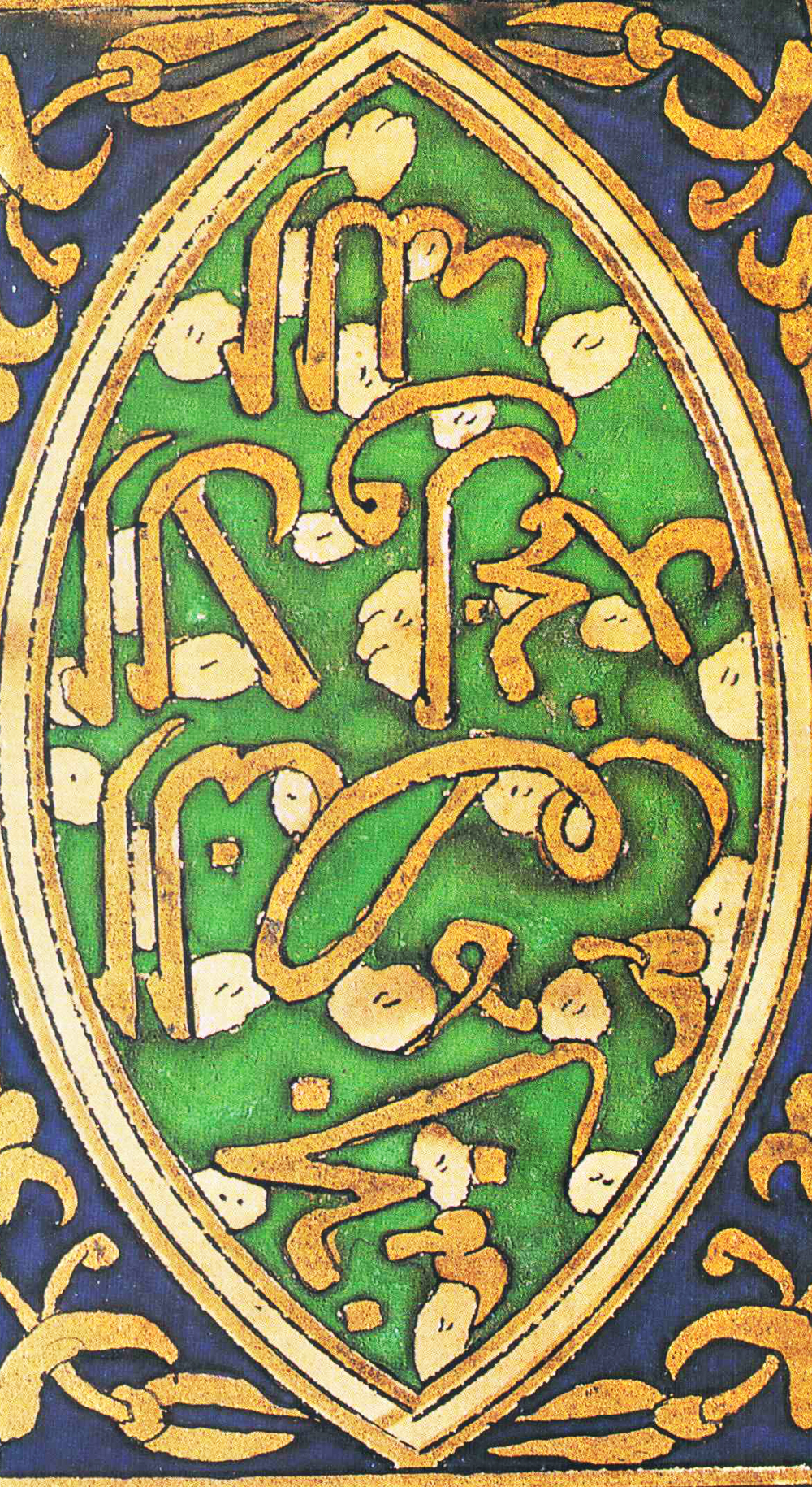 خط مغربی/ صفحه ای به خط القندوسی، رنگ های مورد استفاده برای بخش مرکزی، صامت ها و مصوت ها و علایم تشخیص برعکس است/ صفحه 63 کتاب