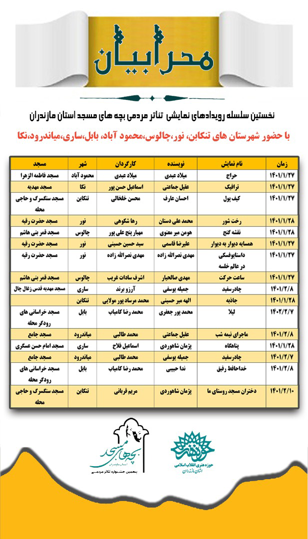 به گزارش روابط عمومی حوزه هنری مازندران از شنبه ۲۷ فروردین سال جاری نخستین رویداد بزرگ نمایشی بچههای مسجد مازندران با عنوان « محرابیان» در ۸ شهرستان استان شروع خواهد شد.
