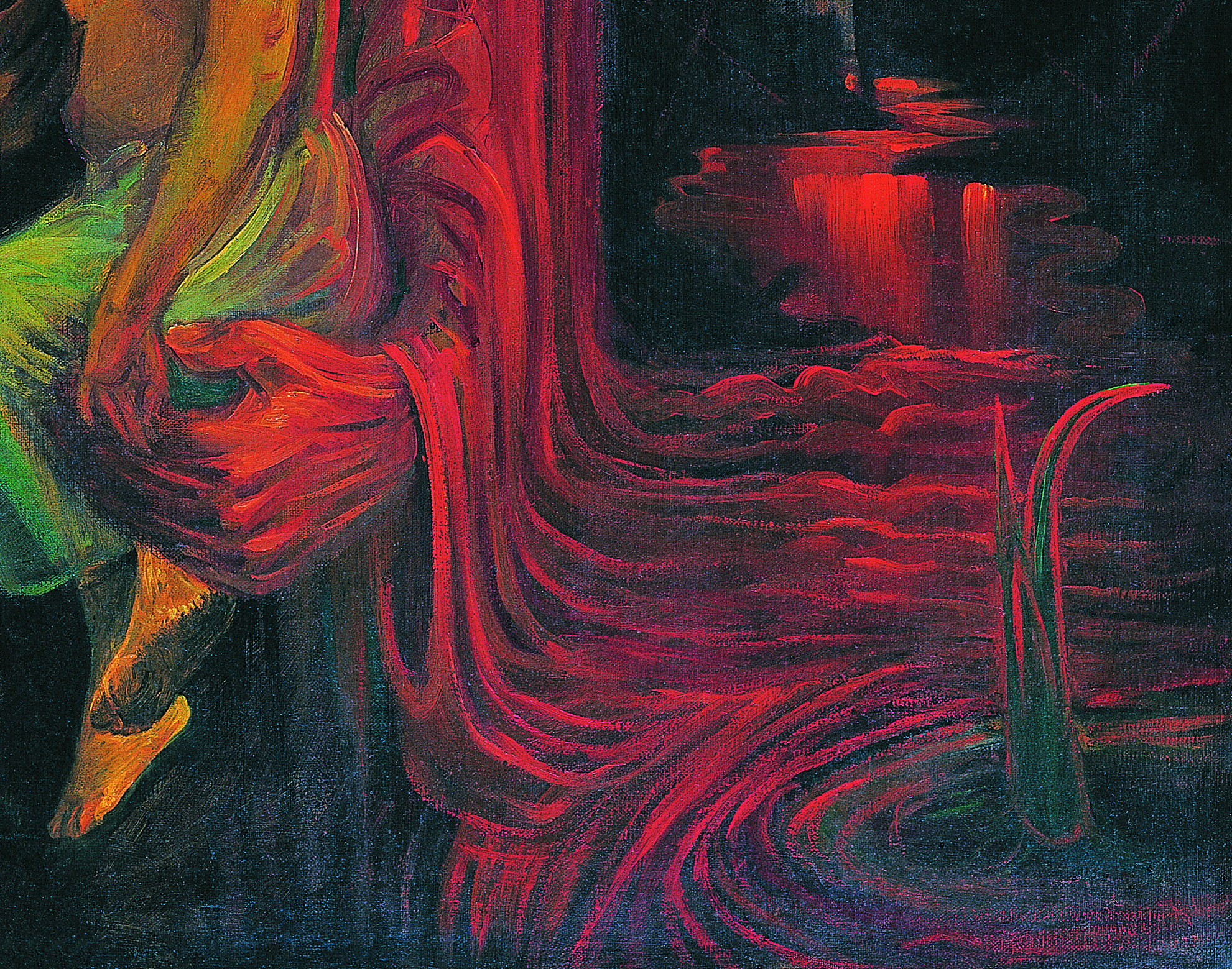 در این تابلو رنگ های قرمز و نارنجی در کنار آبی ها و خاکستری ها ترکیب مناسبی را به وجود آورده است. استفاده از رنگ قرمزِ درخشان که نمادی از خون شهداست به جا و چشم گیر است و مفهومِ ذهنیِ نقاش را به بیننده منتقل می کند.