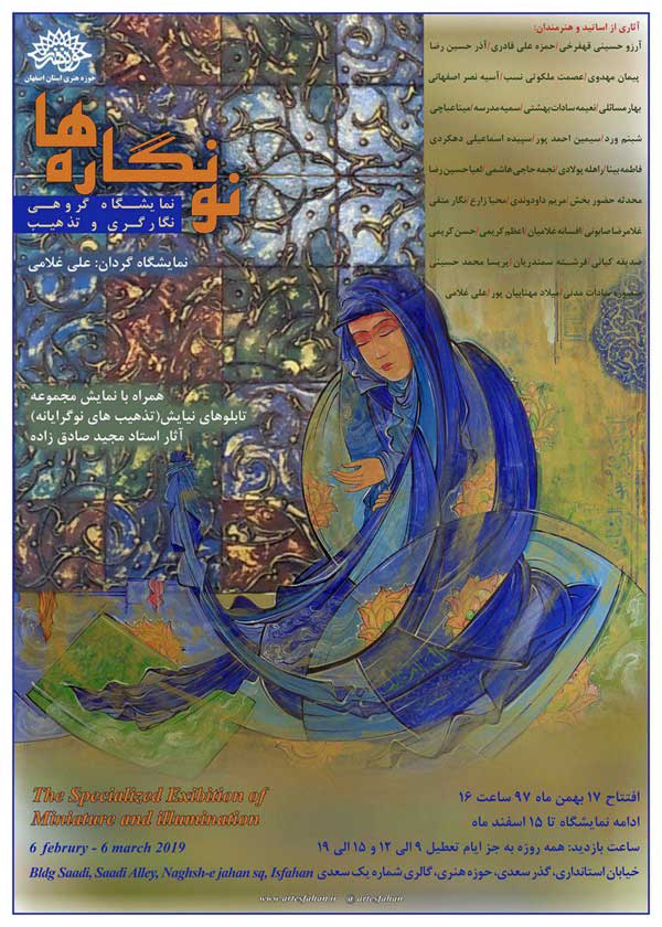 به گزارش روابط عمومی حوزه هنری استان اصفهان، این نمایشگاه که شامل 40 اثر از آثار نگارگری و تذهیب 31 نفر از نگارگران و تذهیب کاران اصفهانی است از ساعت 16 روز چهارشنبه 17 بهمن ماه در میان جمعی از نگارگران اصفهانی و با حضور استاد مجید صادق زاده در گالری سعدی واقع در عمارت سعدی حوزه هنری در خیابان استانداری اصفهان افتتاح می شود.
