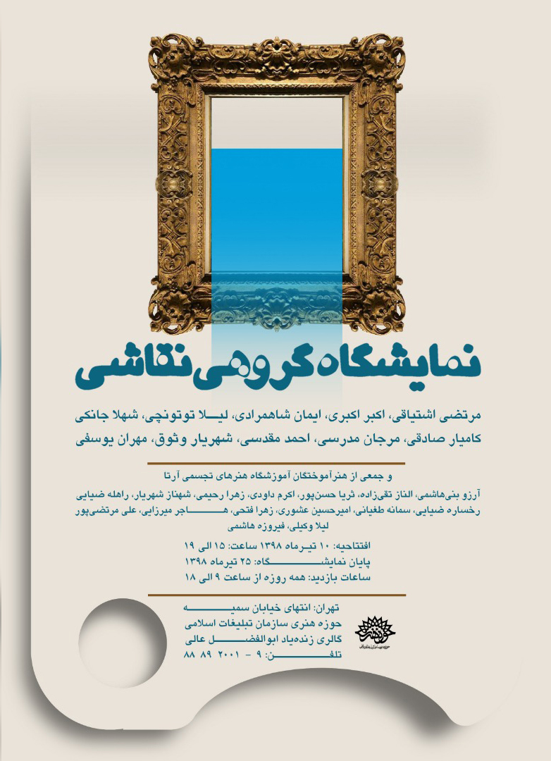 به گزارش روابط عمومی مرکز تجسمی حوزه هنری، گالری زندهیاد ابولفضل عالی میزبان نمایشگاه گروهی نقاشی جمعی از اساتید و هنرمندن هنرهای تجسمی میشود. این نمایشگاه به همت مرکز هنرهای تجسمی حوزه هنری با آثاری از هنرمندانی از جمله مرتضی اشتیاقی، اکبر اکبری، ایمان شاهمرادی، لیلا توتونچی، شهلا جانکی، کامیار صادقی، مرجان مدرسی، احمد مقدسی، شهریار وثوق، مهران یوسفی و جمعی از هنر آموختگان آموزشگاه هنرهای تجسمی آرتا برپا میشود.