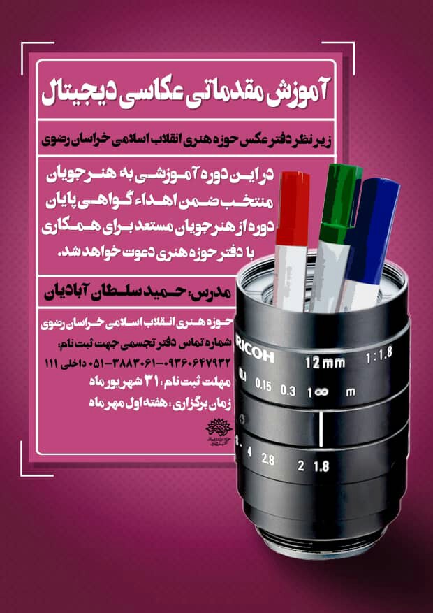 گفتنی است در پایان این دوره ضمن اعطای گواهینامه، از هنرمندان مستعد جهت همکاری با دفتر عکس حوزه هنری خراسان رضوی دعوت به عمل خواهد آمد.