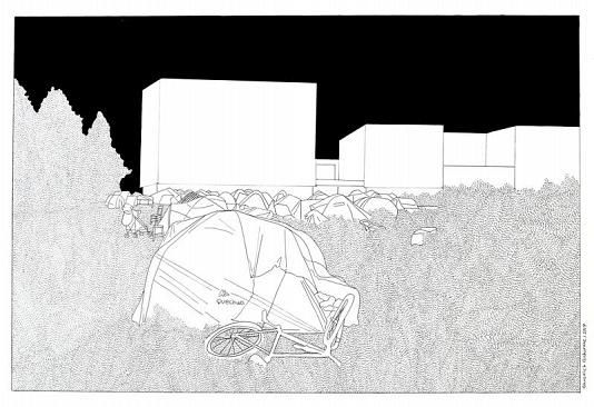 بخش دیگری از این نمایشگاه به طراحیهایی سیاهقلم از چادرهای پناهجویان اختصاص دارد. او وضعیت زندگی پناهندگان و مهاجران را با تضاد سطوح سیاه و سفید و خطوط نازک و آسیبپذیر نشان میدهد.