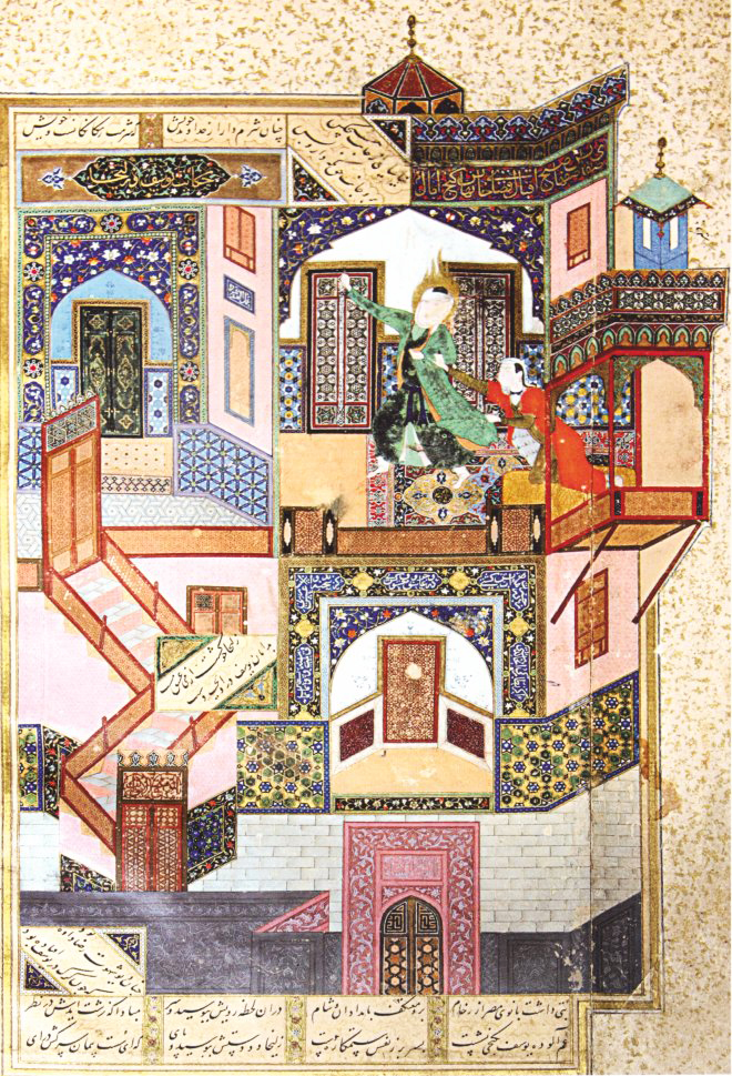 یوسف در قصر زلیخا/ اثر کمال الدین بهزاد/ 1488، 894 ق/ هرات/ آبرنگ مات و مرکب و طلا بر کاغذ/ اندازه صفحه 21.5 در 30.5 سانتی متر/ قاهره/ کتابخانه و مرکز اسناد ملی مصر